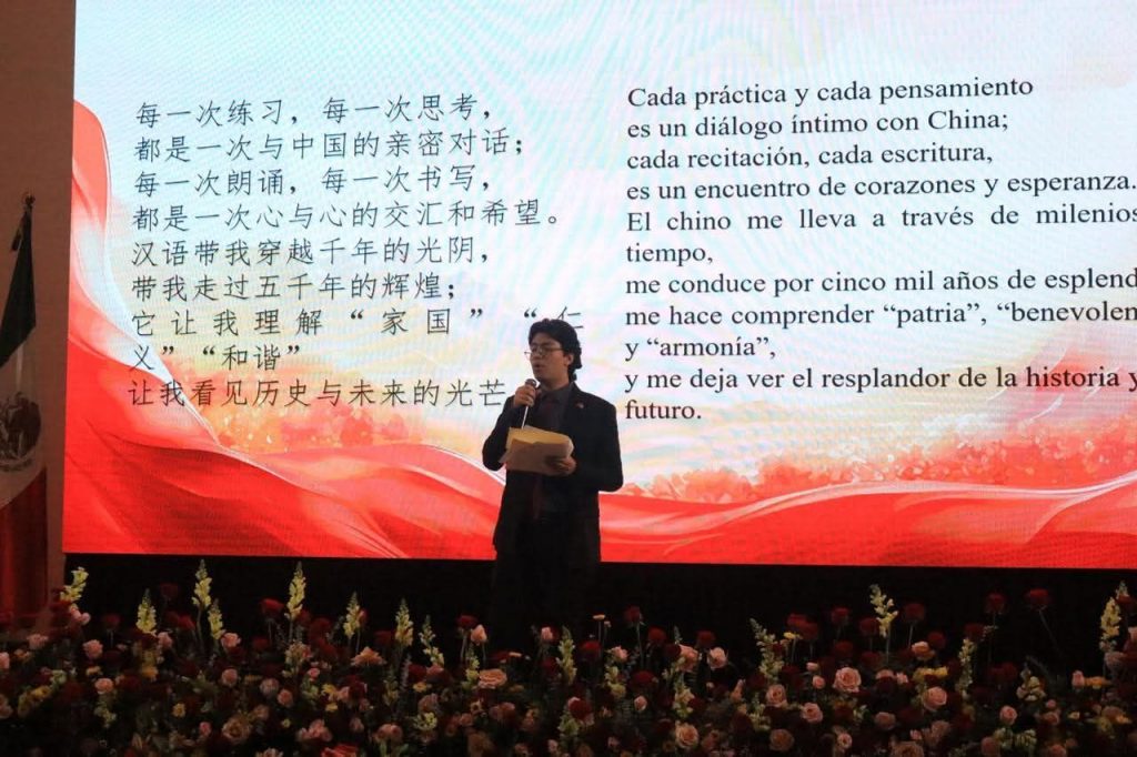 Durante la ceremonia, el estudiante Emiliano Jiménez representó al Instituto Confucio UACH con la recitación de un poema en chino mandarín, demostrando el compromiso, esfuerzo y dedicación que implica el aprendizaje de este idioma y la importancia del intercambio cultural entre México y China.