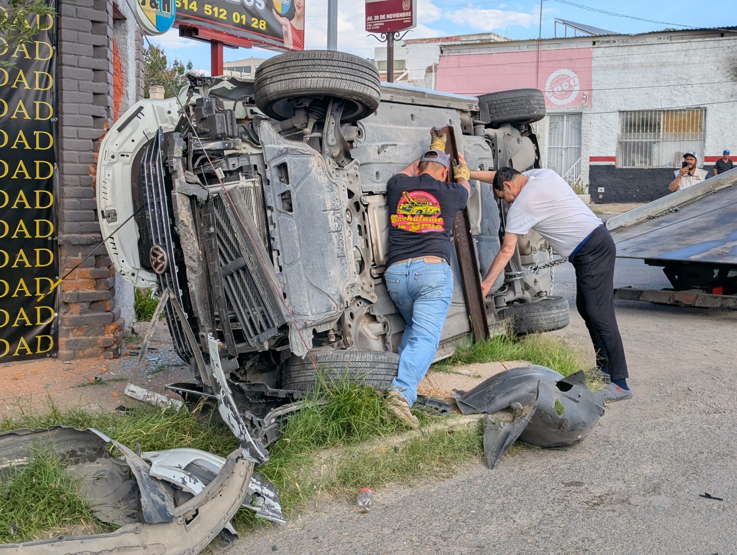 El conductor del Jetta impactó fuertemente a la camioneta. Debido a la fuerza del golpe, el Jetta salió proyectado hacia el carril contrario, volcando y terminando por chocar contra una barra de contención y la barda perimetral de un negocio.