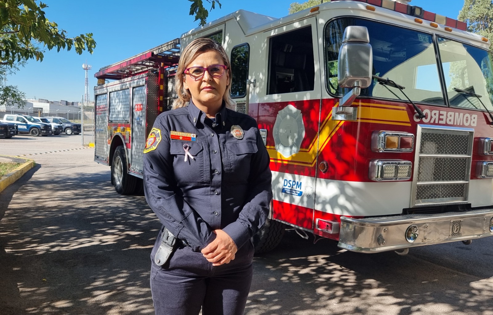 Sandra Durán , cuenta con 14 años de antigüedad en el H. Cuerpo de Bomberos de Chihuahua y actualmente tiene el grado de bombero segundo, se define como una guerrera, una luchadora que sobrevivió al cáncer de mama y la transformó en una persona fuerte, más cuando recuerda la frase que le han repetido: “si pudiste con eso puedes con todo.”