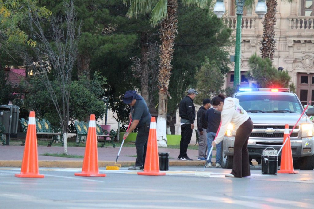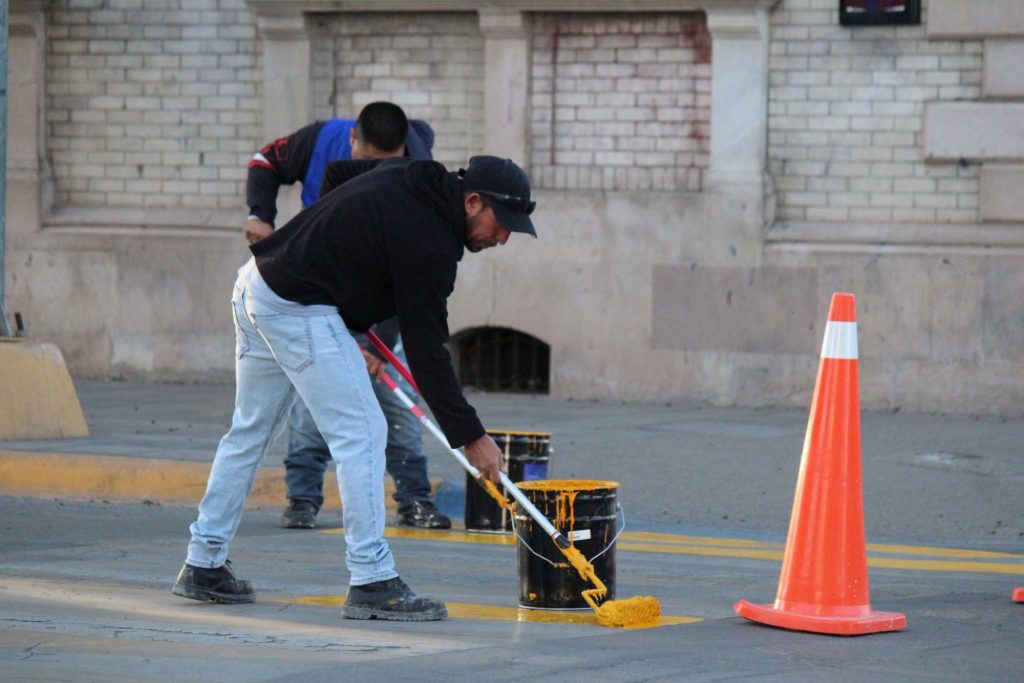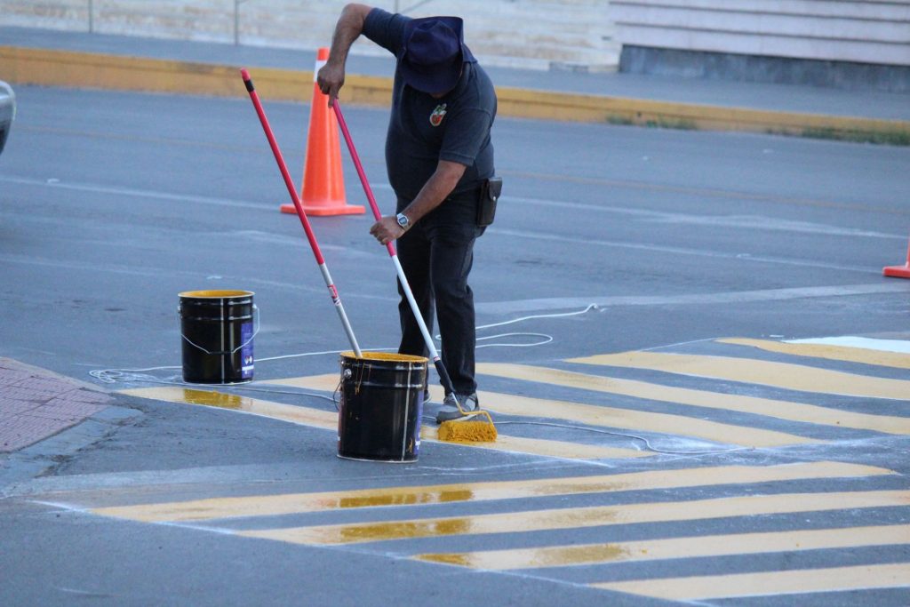 El personal de Movilidad inició los trabajos desde primera hora en zonas clave de la capital, entre las que destacan el primer cuadro de la ciudad y el Periférico de la Juventud, en las cercanías de Distrito 1, donde se realizaron labores de mantenimiento y renovación de pintura para pasos peatonales.
