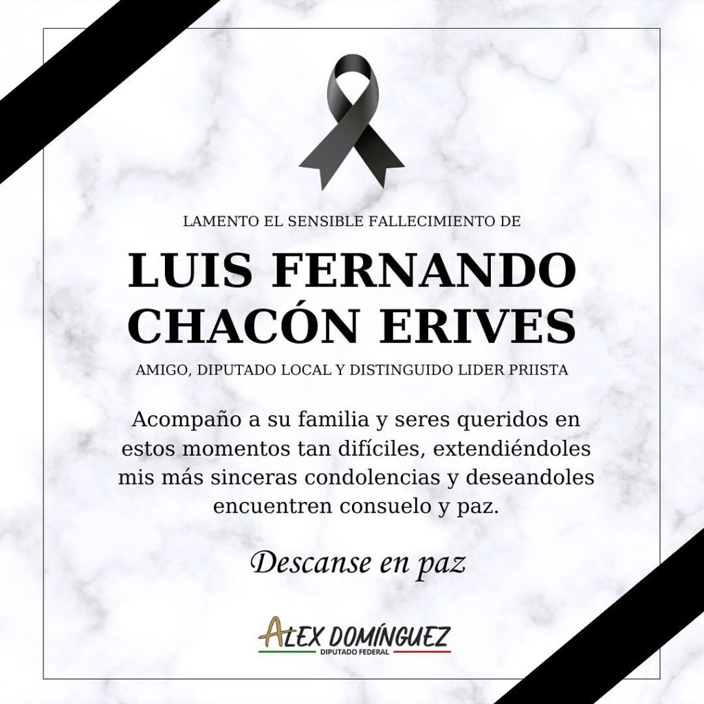 “Lamento profundamente el fallecimiento de mi amigo y compañero de partido Luis Fernando Chacón Erives, destacado líder priista y diputado local comprometido con las causas de Chihuahua. Su partida deja un gran vacío en la política y en la vida de quienes tuvimos el privilegio de conocerlo. Mi más sentido pésame a su familia, amigos y seres queridos.”