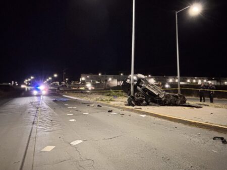 La madrugada de este domingo, un violento accidente en la carretera Chihuahua–Juárez, a la altura del kilómetro 15, terminó con la muerte de dos personas, luego de que un Nissan Altima se estrellara contra un poste de luz mercurial.