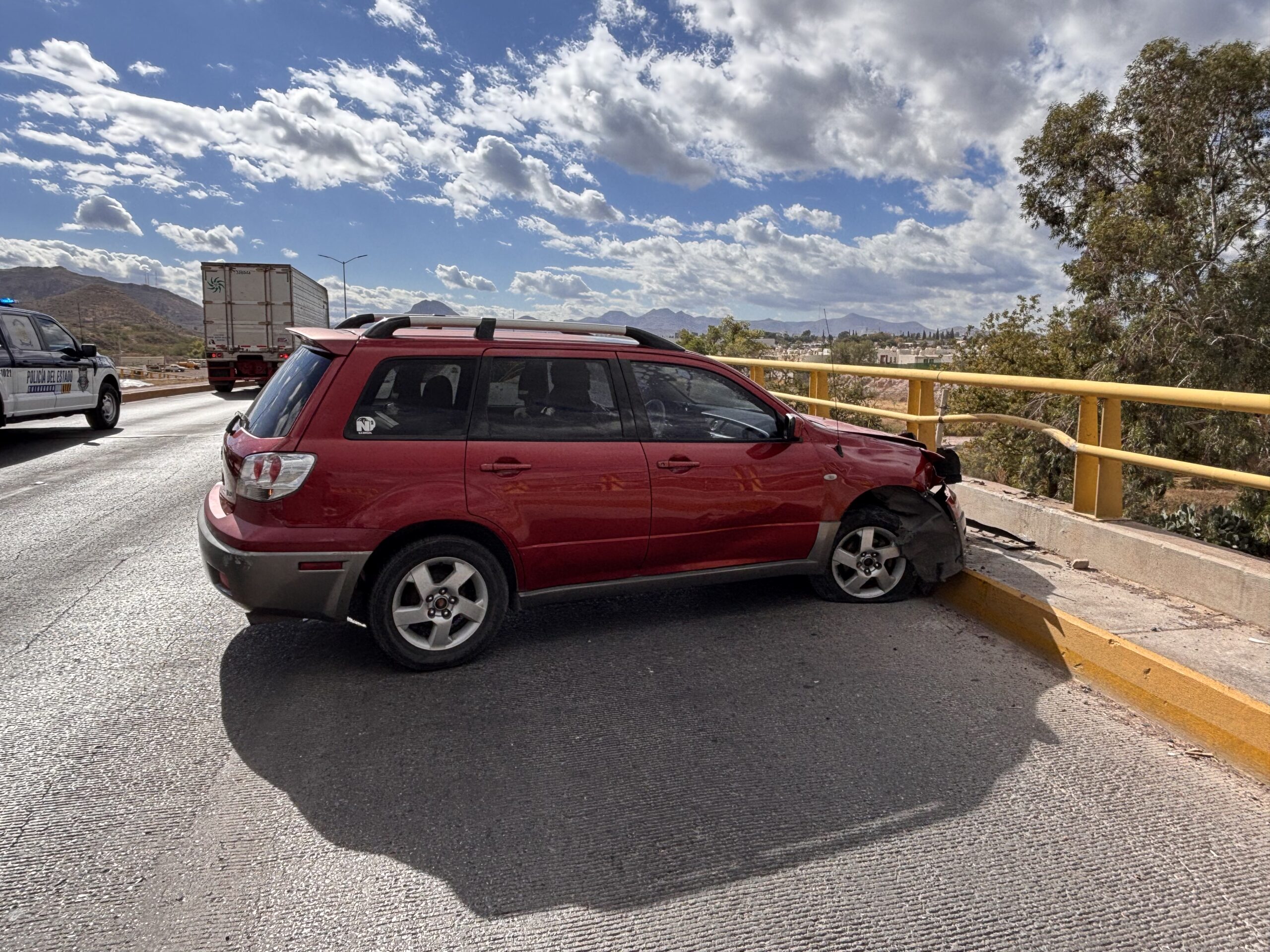 Esta mañana se registró un incidente vial sobre la Vialidad Sacramento, cruce con Juan de la Barrera, en la colonia Nombre de Dios, cuando una camioneta Mitsubishi Outlander se estrelló de manera frontal contra la baranda de un paso a desnivel.