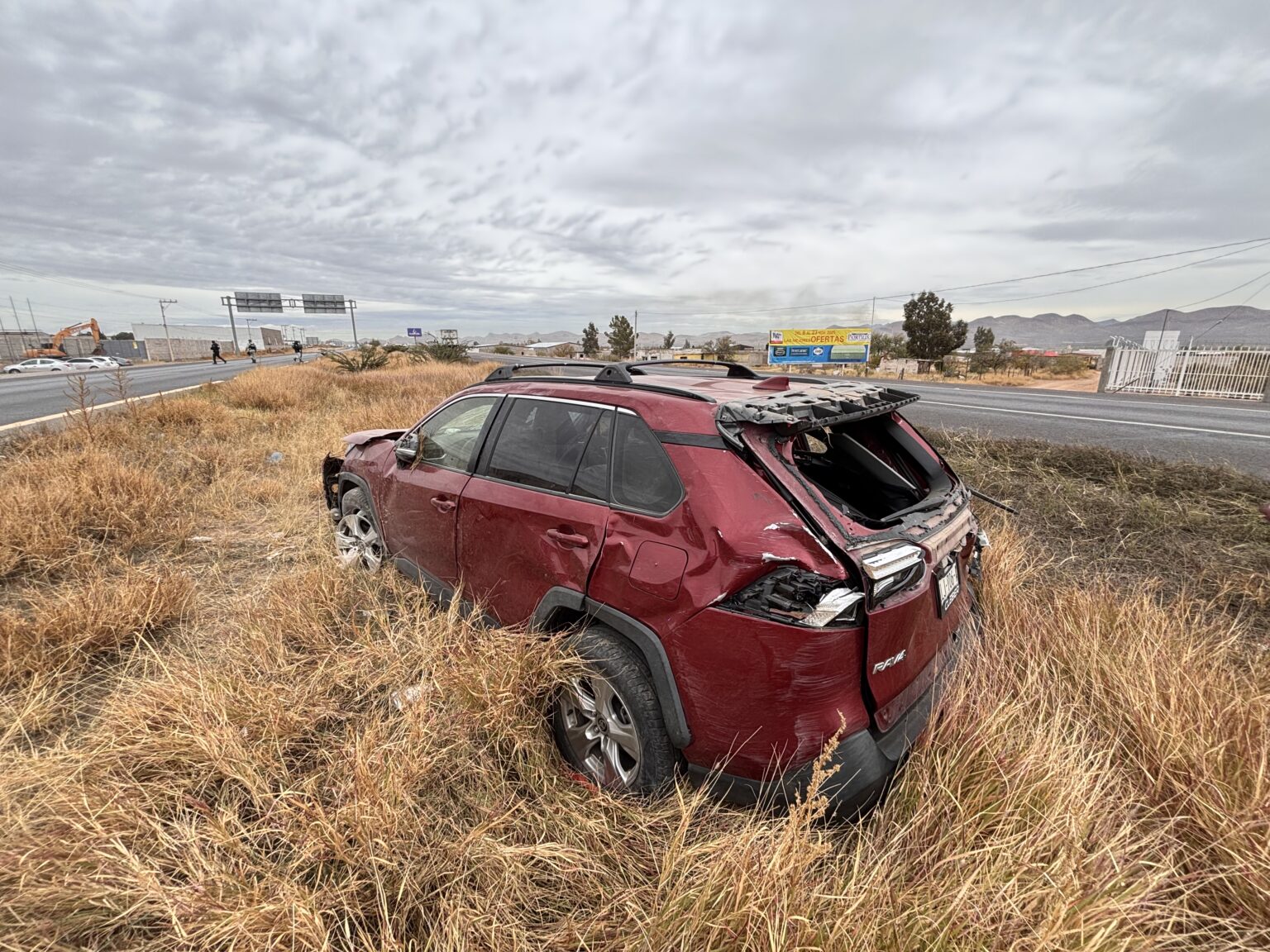 Un aparatoso accidente se registró este viernes sobre la carretera Juárez-Chihuahua, luego de que el conductor de una camioneta Toyota RAV4 perdiera el control tras una ligera colisión. El vehículo chocó contra el camellón central y dio por lo menos dos volteretas, quedando severamente dañado.