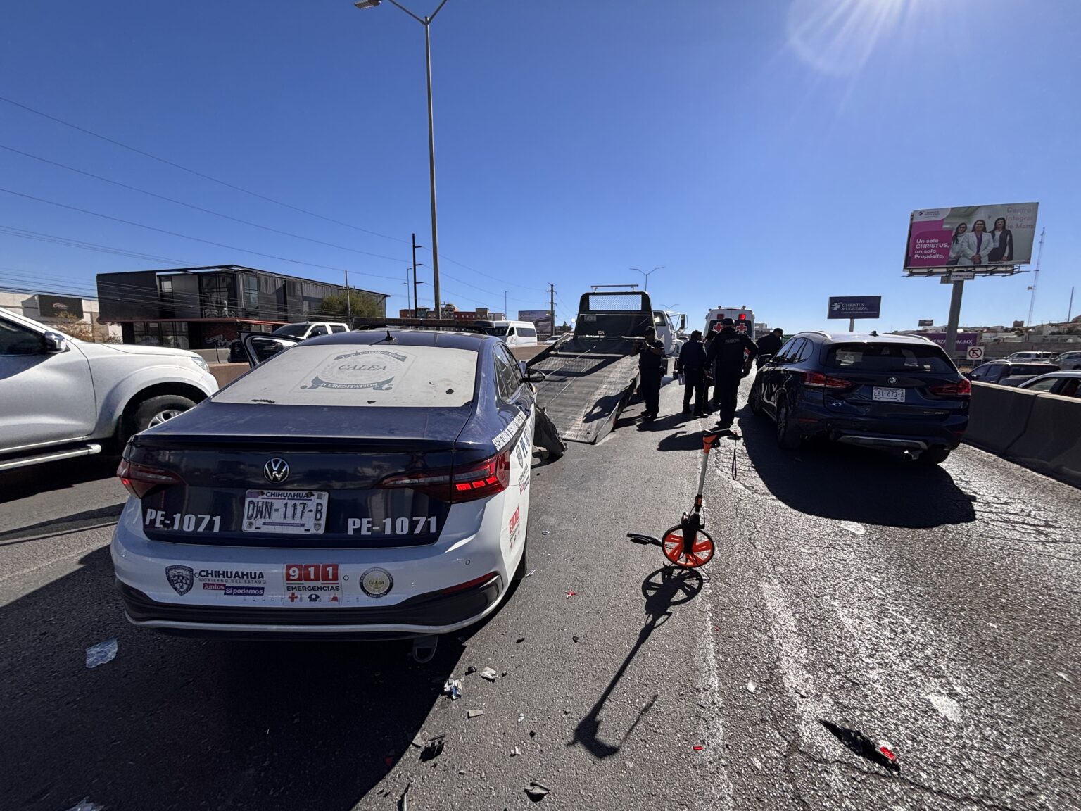 Los socorristas realizaron la extracción de la agente del interior del vehículo y la trasladaron en ambulancia a un hospital para su atención médica. La unidad oficial involucrada, un Volkswagen Jetta con número económico 1071, presentó daños materiales considerables, por lo que el área fue abanderada y los vehículos retirados con apoyo de una grúa.