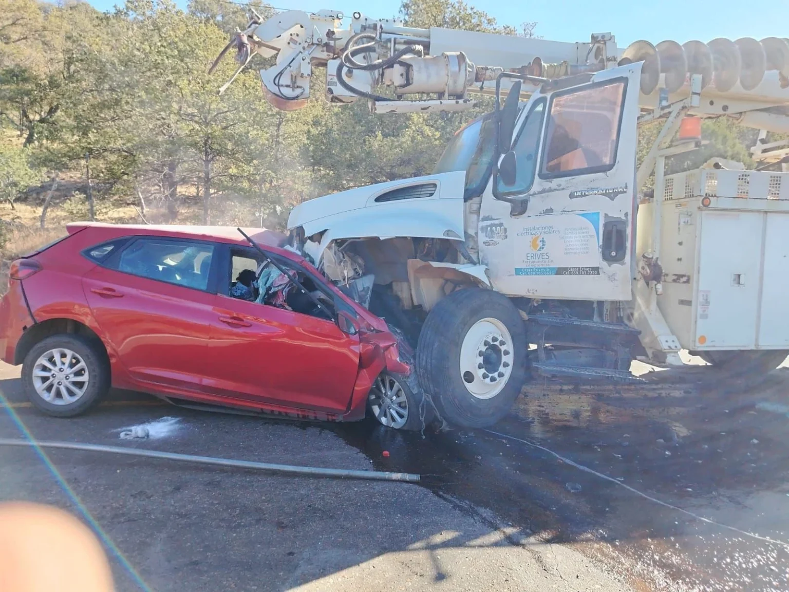 De acuerdo con los primeros reportes, el accidente ocurrió alrededor de las 11:20 horas y estuvo involucrado un vehículo Hyundai Accent tipo coupé, color rojo, así como un camión grúa marca International, color blanco, perteneciente a la empresa Instalaciones Eléctricas Erives.