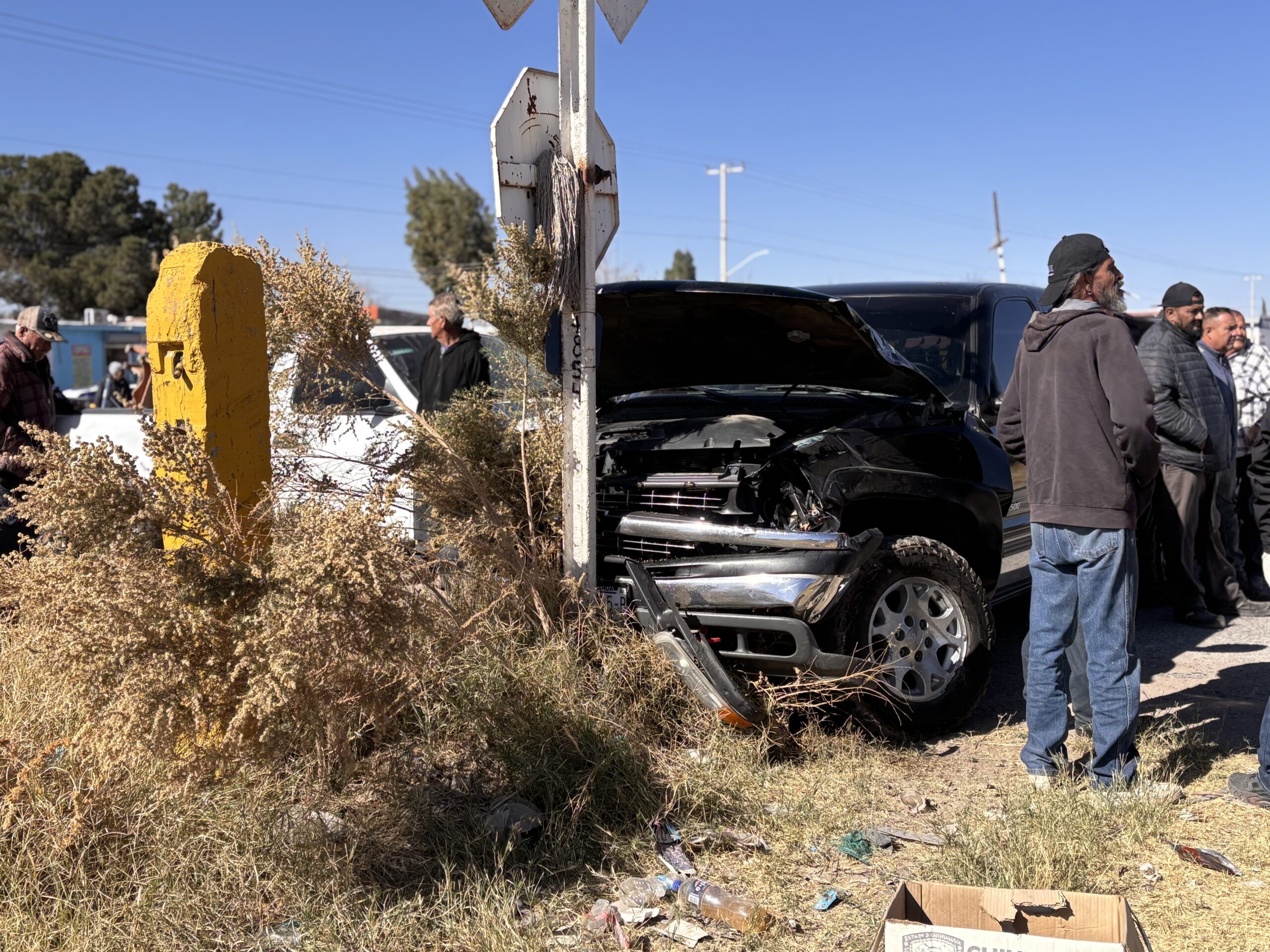 Testigos señalaron que la pickup se encontraba detenida sobre las vías al momento en que el tren la impactó de manera frontal-lateral, provocando que fuera proyectada varios metros hasta chocar contra un señalamiento de alto ubicado en el lugar.