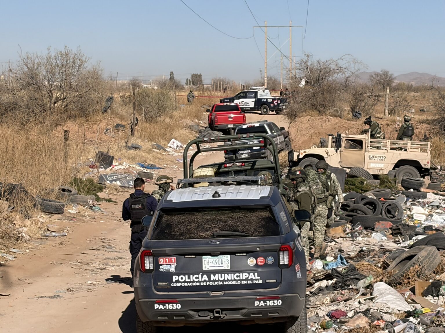 Elementos de la Policía Municipal acudieron a la avenida de las Industrias, a la altura del poste número 37, en la colonia Granjas Avícolas Francisco Villa, donde tras una inspección localizaron el cuerpo oculto debajo de al menos tres neumáticos, lo que dificultó su detección a simple vista.