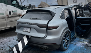 Una camioneta Porsche Cayenne terminó completamente destruida tras un aparatoso accidente registrado la tarde de este viernes a la altura del kilómetro 173 de la carretera a Ciudad Juárez, luego de que su conductor perdiera el control del volante y se impactara contra un señalamiento vial, provocando que la unidad se incendiara.