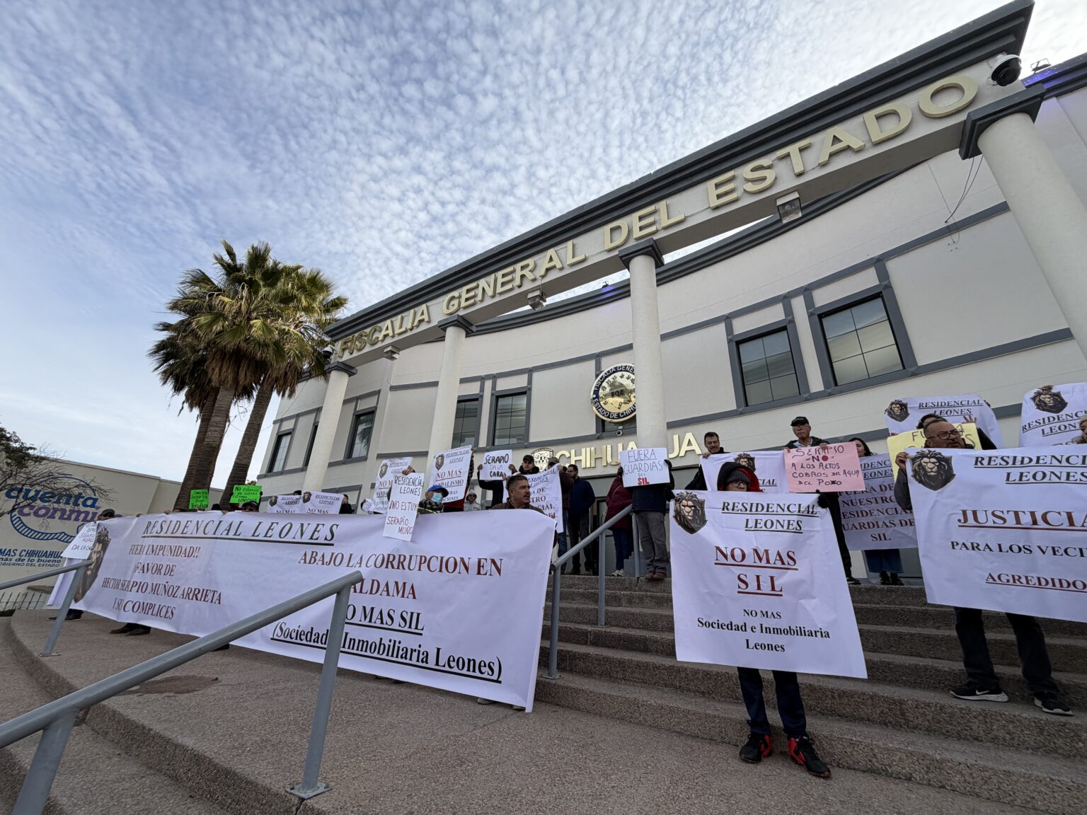 La mañana de este día, residentes del fraccionamiento Los Leones se manifestaron al exterior de la Fiscalía General del Estado para denunciar a un hombre identificado como Héctor Serapio Muñoz Arrieta, quien funge como representante legal del lugar y a quien acusan de generar constantes disturbios, robos y afectaciones en perjuicio de aproximadamente 300 familias.