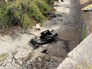 Un automóvil Ford modificado cayó a un arroyo de aproximadamente 15 metros de profundidad, luego de que su conductor perdiera el control al girar hacia su izquierda y se impactara contra una barrera vial.