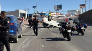 Chihuahua, Chih.— Un accidente de tránsito con volcadura se registró este miércoles sobre el Periférico de la Juventud, en el cruce con Mirador, en sentido norte-sur, involucrando a una pickup Mitsubishi L200 y una camioneta Haval azul.