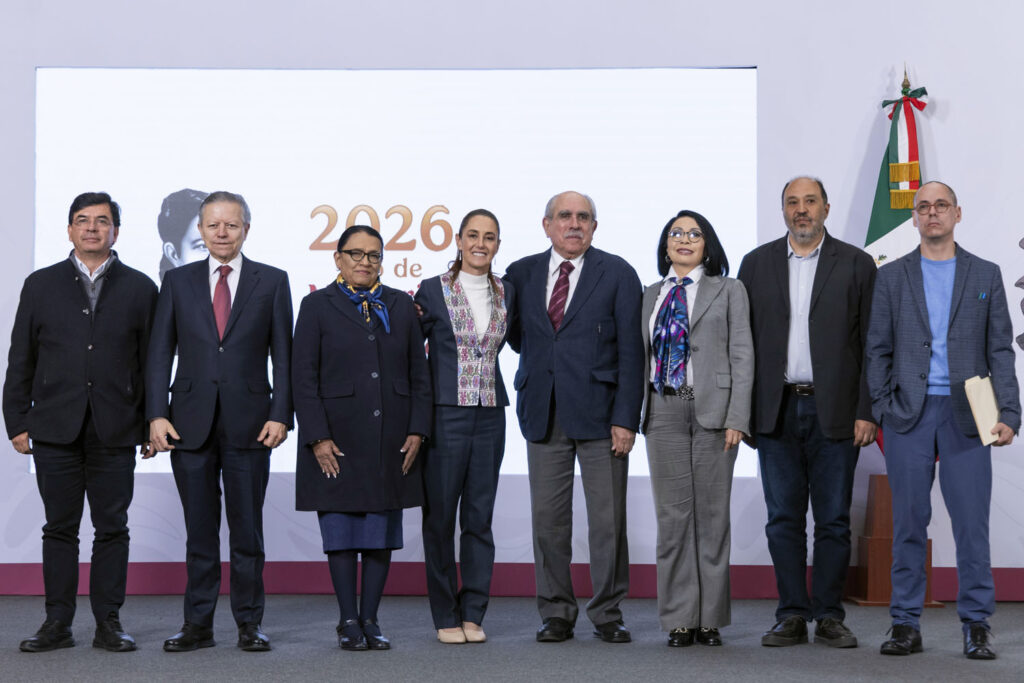 Cuauhtémoc, Ciudad de México. 25 de febrero 2026. La presidenta constitucional de los Estados Unidos Mexicanos, la Doctora Claudia Sheinbaum Pardo en conferencia de prensa matutina en el salón de la Tesorería de Palacio Nacional. La acompañan: Rosa Icela Rodríguez Velázquez, secretaria de Gobernación; Pablo Gómez comisionado presidente de la Comisión Presidencial para la Reforma Electoral; Arturo Zaldívar, coordinador de Política y Gobierno; Lázaro Cárdenas Batel, Jefe de la Oficina de la Presidencia; Jesús Ramírez Cuevas, coordinador de asesores de la Presidencia de la República; Merino, Director de la agencia de transformación digital y Telecomunicaciones; Esthela Damián Peralta, consejera jurídica del Ejecutivo Federal y Miguel Ángel Elorza Vázquez, coordinador de Infodemia. Foto: Juan Carlos Buenrostro/Presidencia