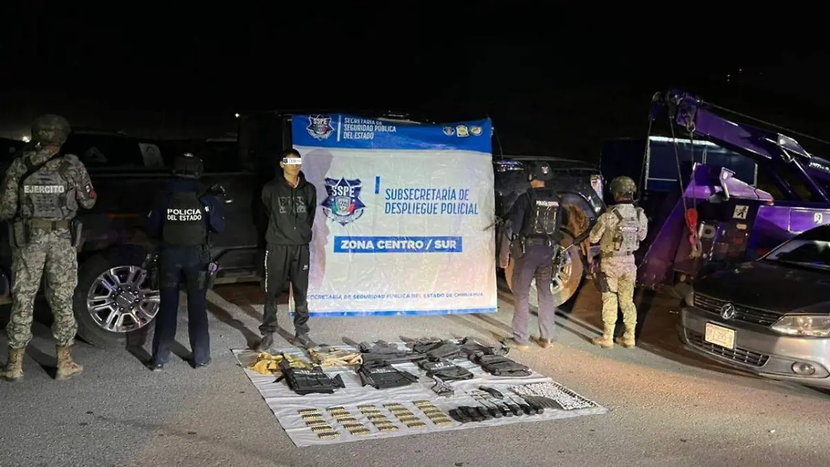 El Sauz, Chih.— La Secretaría de Seguridad Pública del Estado informó sobre el aseguramiento de un hombre armado y el decomiso de 150 dosis de presunta droga, chalecos tácticos, radios de comunicación, cartuchos útiles y dos vehículos, durante un operativo realizado en el poblado de El Sauz.