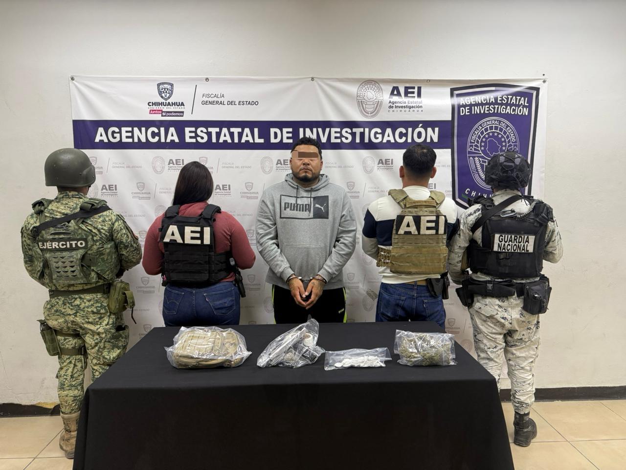 14 de marzo de 2026 – Ciudad Juárez, Chih. – Elementos de la Agencia Estatal de Investigación (AEI), adscritos al Centro de Operaciones Estratégicas (COE), detuvieron en flagrancia a Roberto Rubén O. A., de 36 años, por delitos contra la salud y violación a la Ley Federal de Armas de Fuego y Explosivos de uso Exclusivo del Ejército.