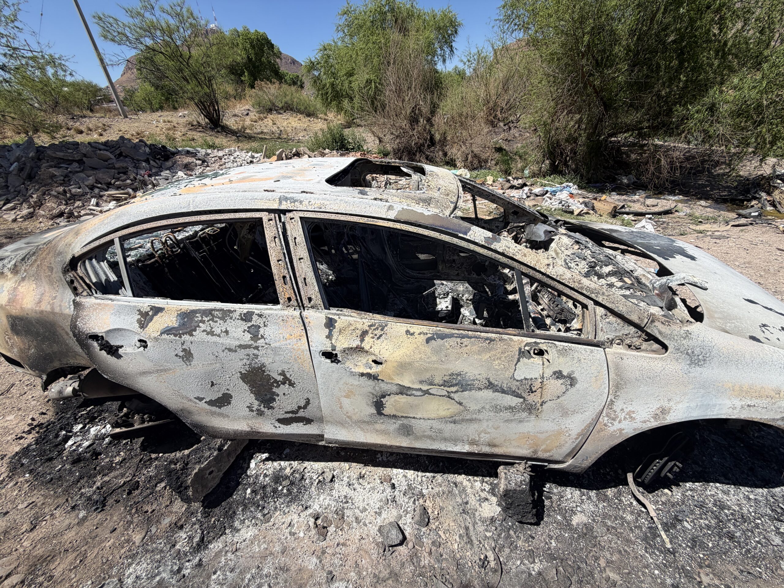 Un vehículo incendiado fue reportado al número de emergencias en las inmediaciones de la colonia Robinson, a la orilla del río Chuvíscar, lo que generó movilización policial.