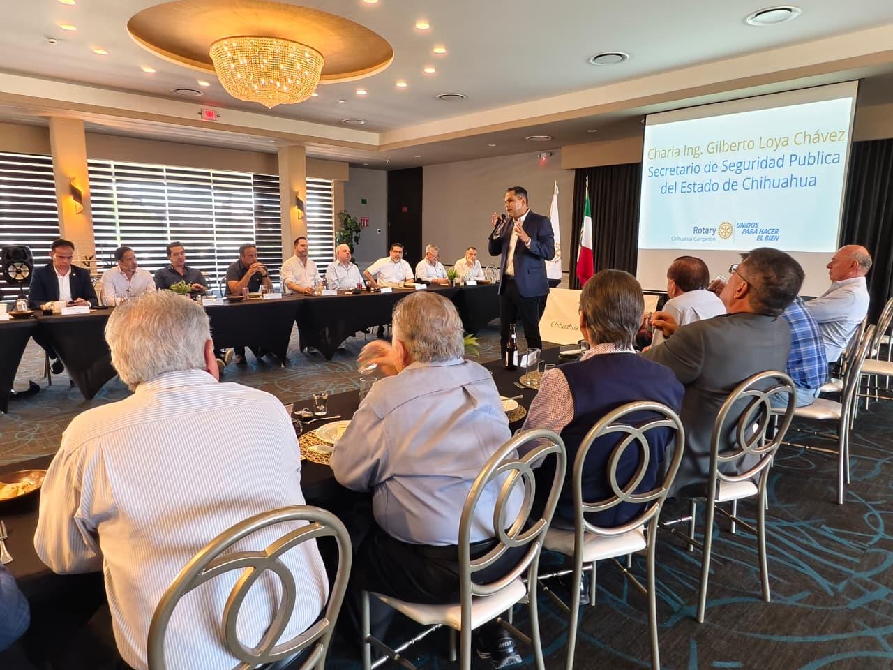 El secretario de Seguridad Pública del Estado, Gilberto Loya, sostuvo una reunión con integrantes del Club Rotario en la ciudad de Chihuahua, donde expuso los avances y resultados de la estrategia de seguridad implementada en la entidad.