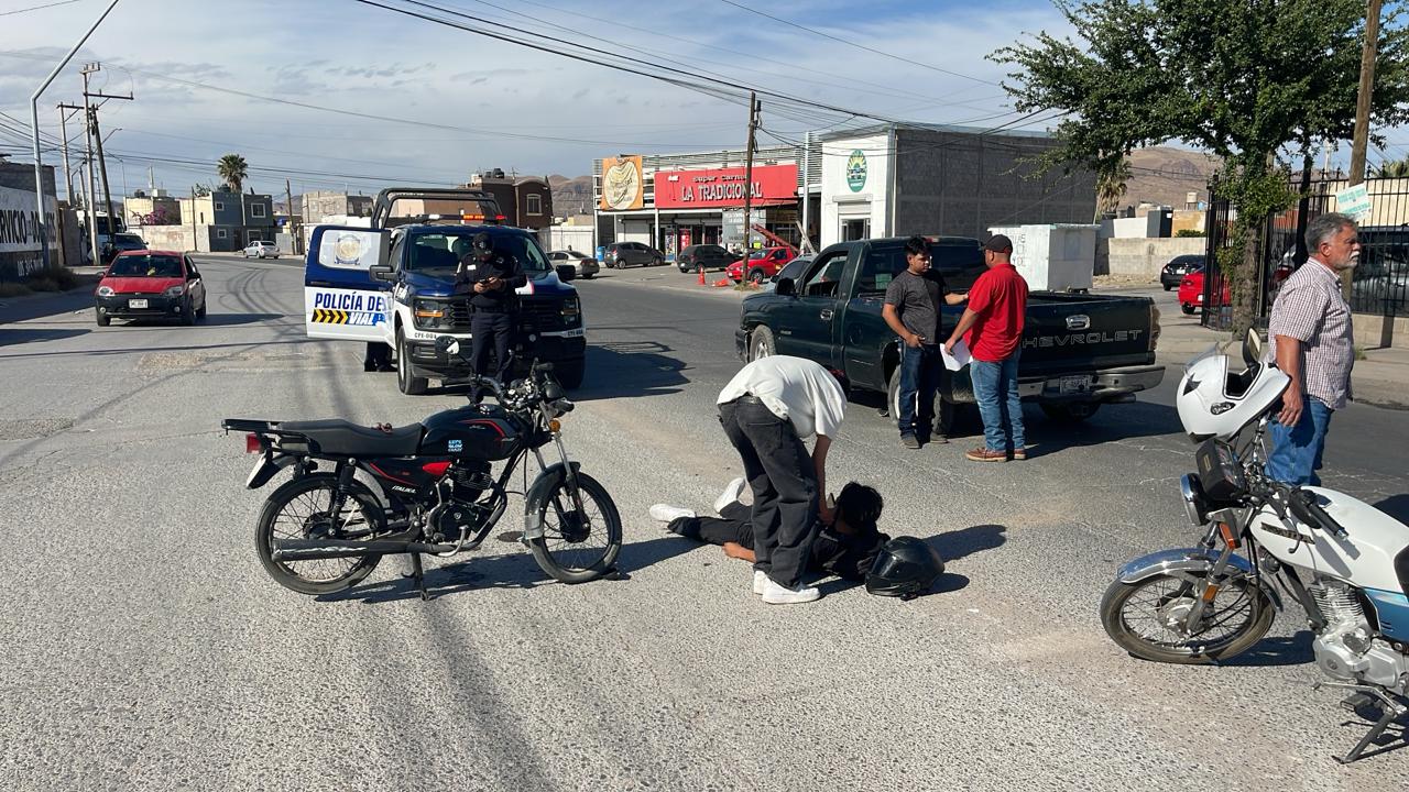 Un joven motociclista resultó lesionado luego de ser impactado por una pickup Chevrolet en el cruce de las calles Paseos del Real y Plaza de Borda, en la colonia Jardines del Sol.