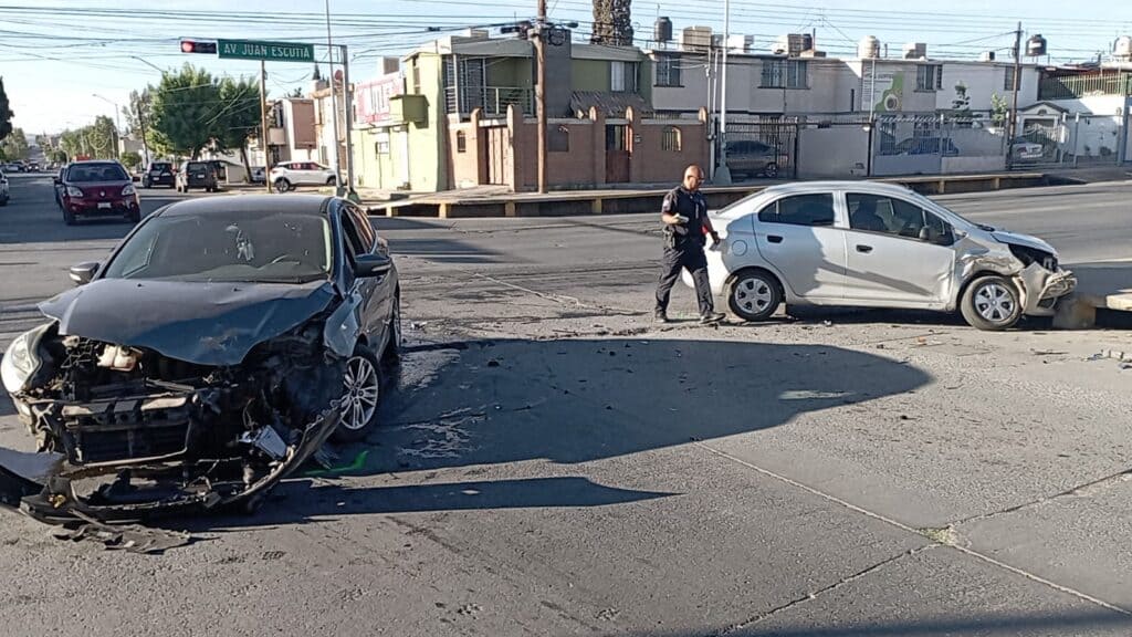 Chihuahua, Chihuahua.– Un fuerte accidente vial se registró en el cruce de la avenida Juan Escutia y la calle Manuel González Cossío, donde dos automóviles protagonizaron un aparatoso choque que, pese a la magnitud del impacto, no dejó personas lesionadas.
