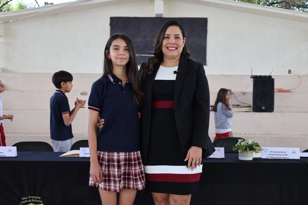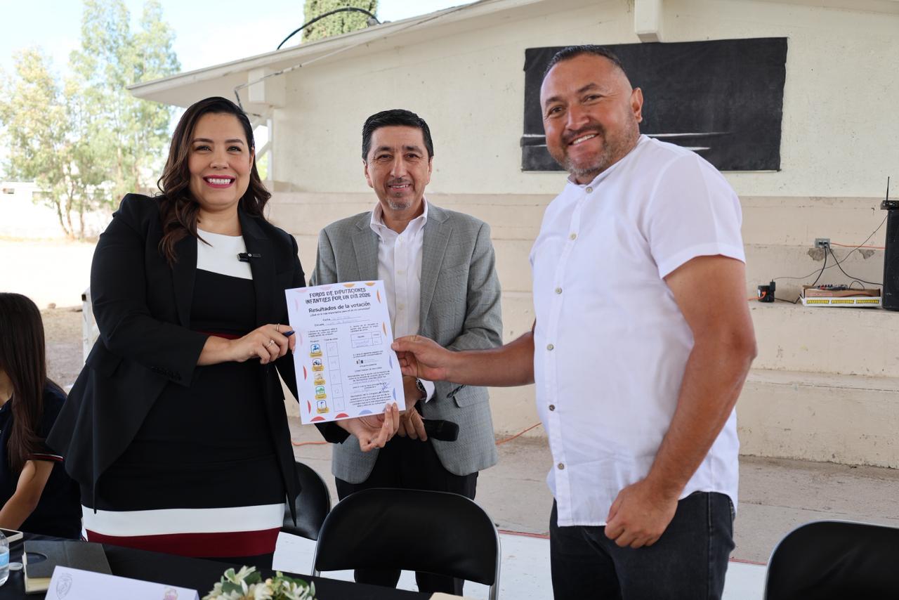 Chihuahua, Chih.- Como parte de las actividades desarrolladas por el Congreso del Estado en el marco del Día de la Niñez, la diputada local por el Distrito 15, Joss Vega, visitó la Escuela Primaria Leyes de Reforma con el objetivo de reconocer a Karen Meza, diputada Infantil 2026, así como para hacer la entrega simbólica del apoyo económico de $82,000 destinados para las mejoras del plantel.